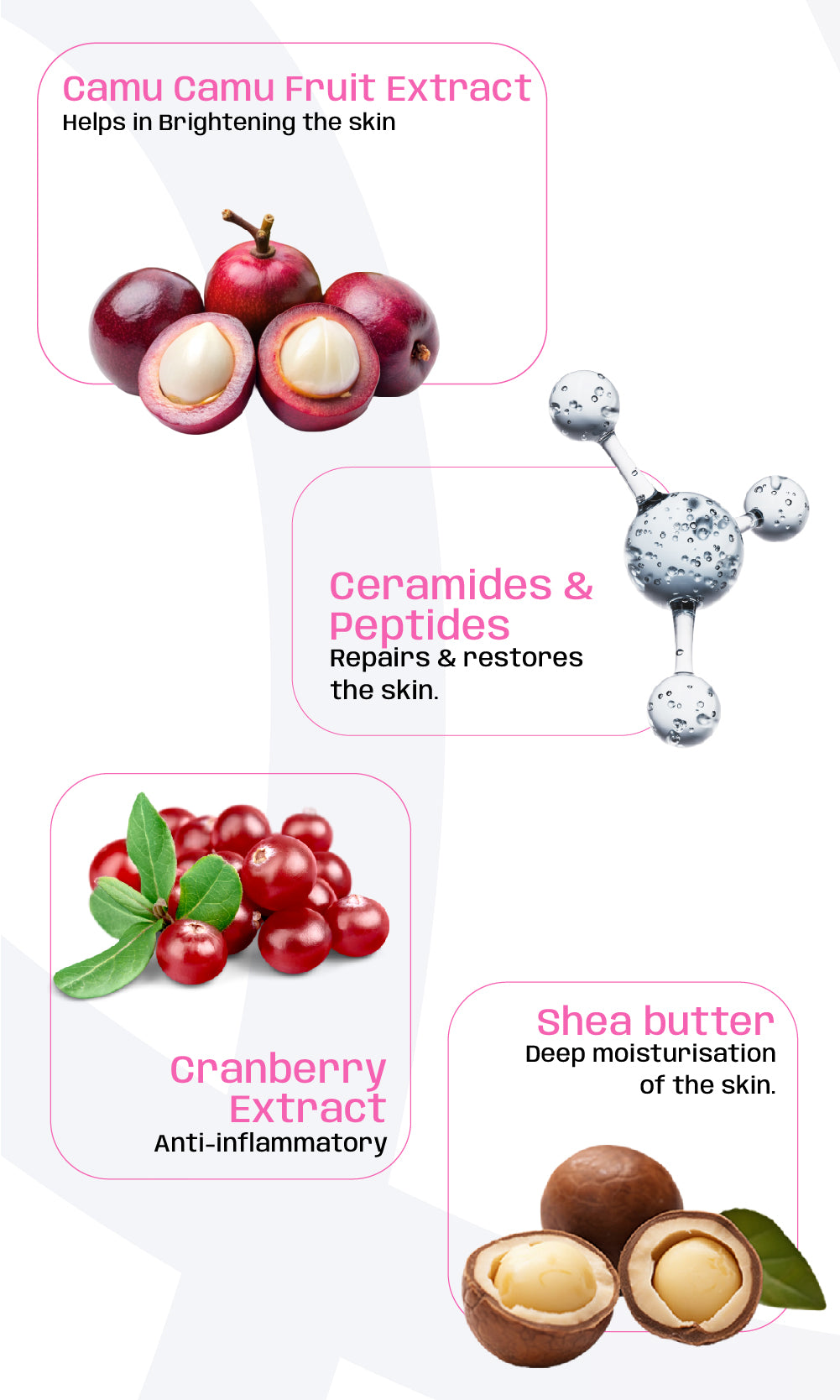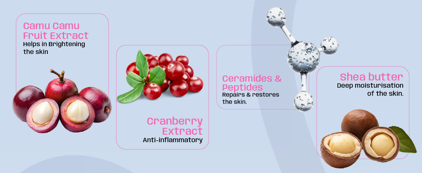 - Camu-Camu Extract: A superfood powerhouse containing 30–50x more Vitamin C than oranges. It boosts radiance, strengthens skin, and fights free radicals.